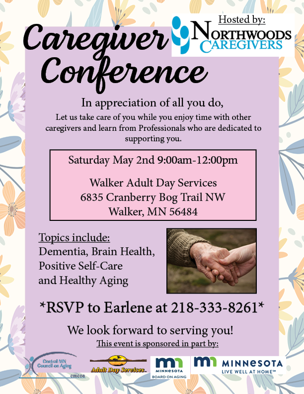 Keep up to date on what’s happening with Northwoods Caregivers and their sponsors! Click the blue links for flyers and additional information. To register for an event or questions, please call our office 218-333-8264.